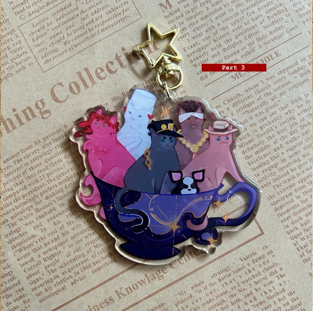 Chibi and cute keychains of Jojo characters turned into cats stuffed into themed teacups! Features characters from parts 3 to 6!