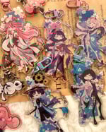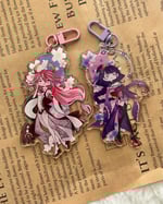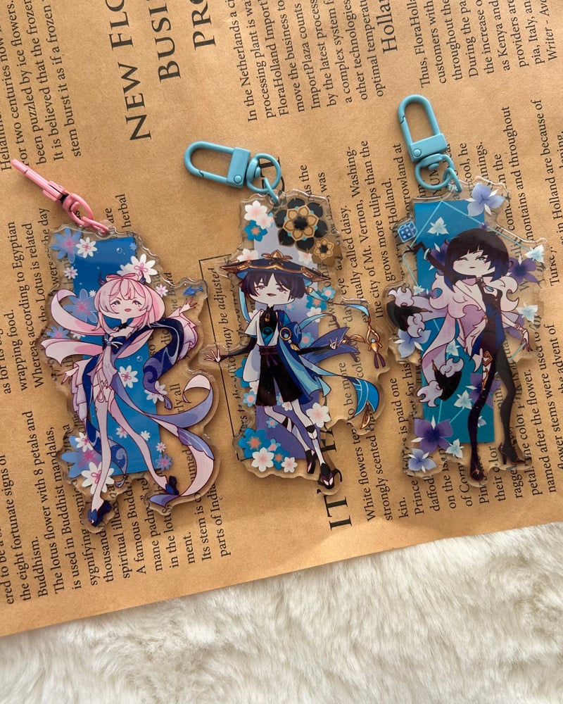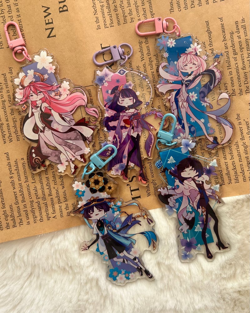 There are five tall acrylic flower design keychains featuring Yae Miko, Raiden Shogun, Kokomi, Wanderer and Yelan!