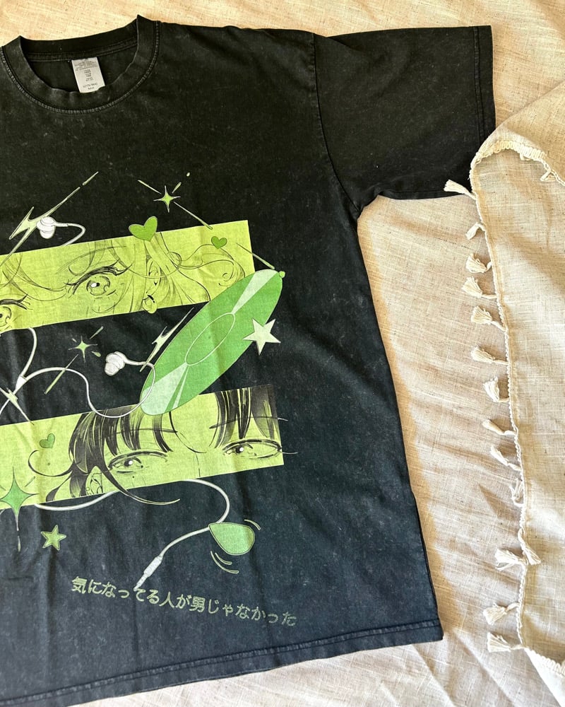 Green Yuri shirt ahhhh! For everyone who wants to rep our favourite music loving couple! This shirt is a Mitsuaya themed washed black shirt, designed and drawn by me to mimic a vintage band tee :D