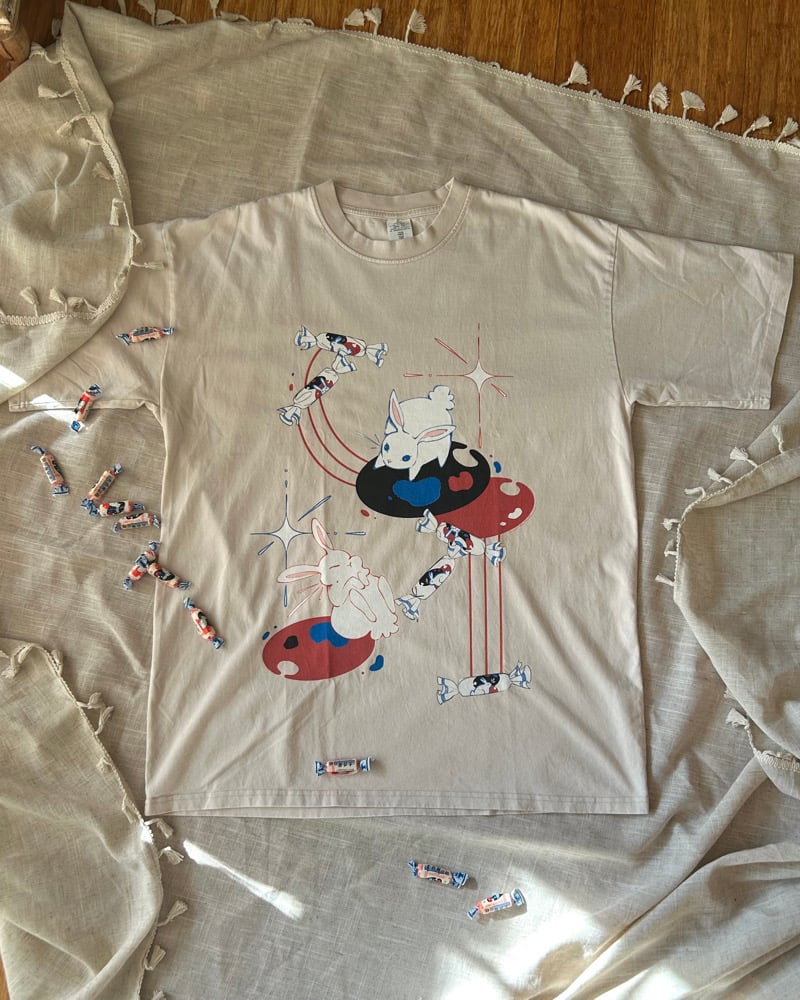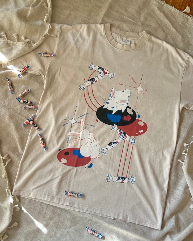 Inspired by a favourite and iconic childhood snack. The iconic White Rabbit Milk Candy! This shirt is a themed shirt after a favourite nostalgic snack of mine and many others!